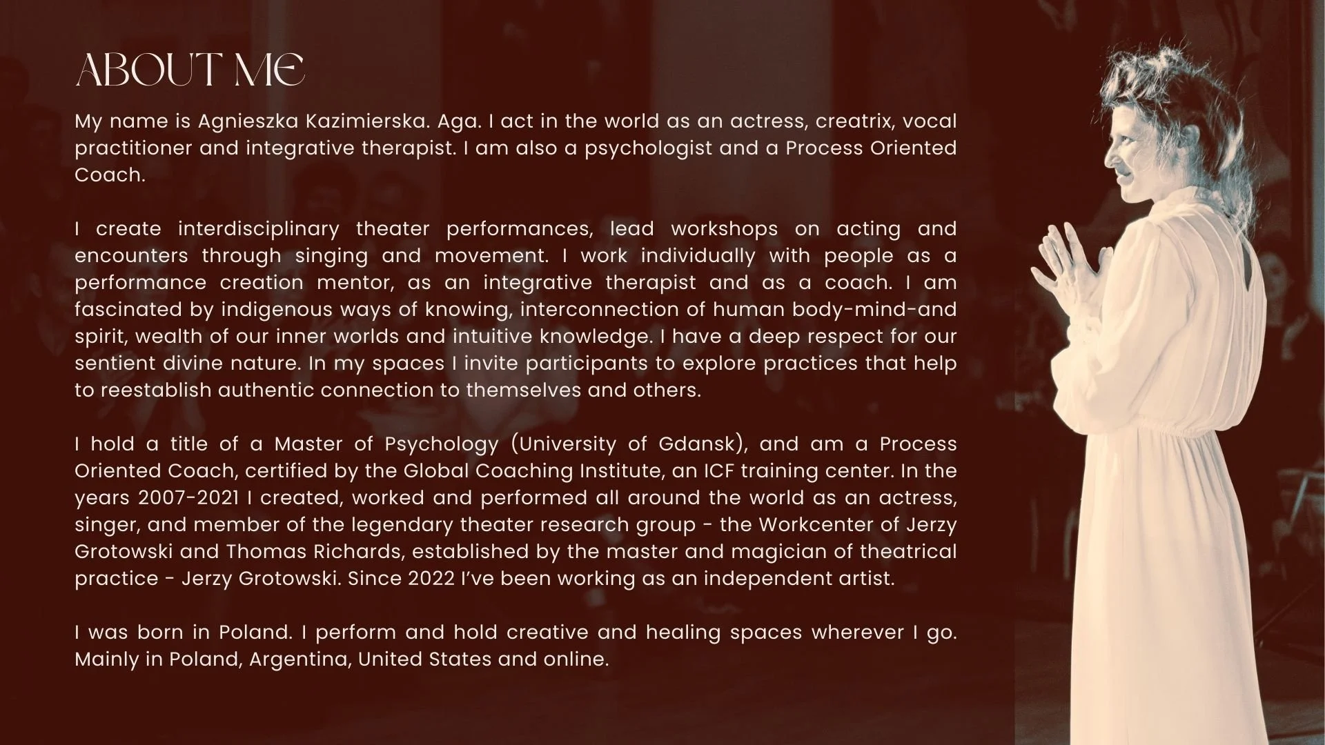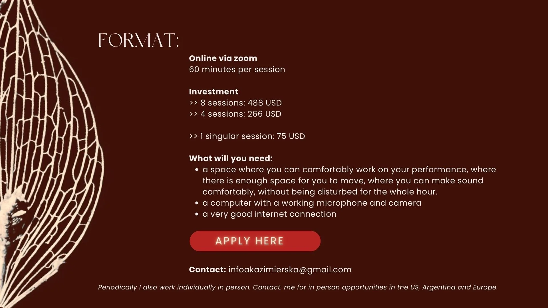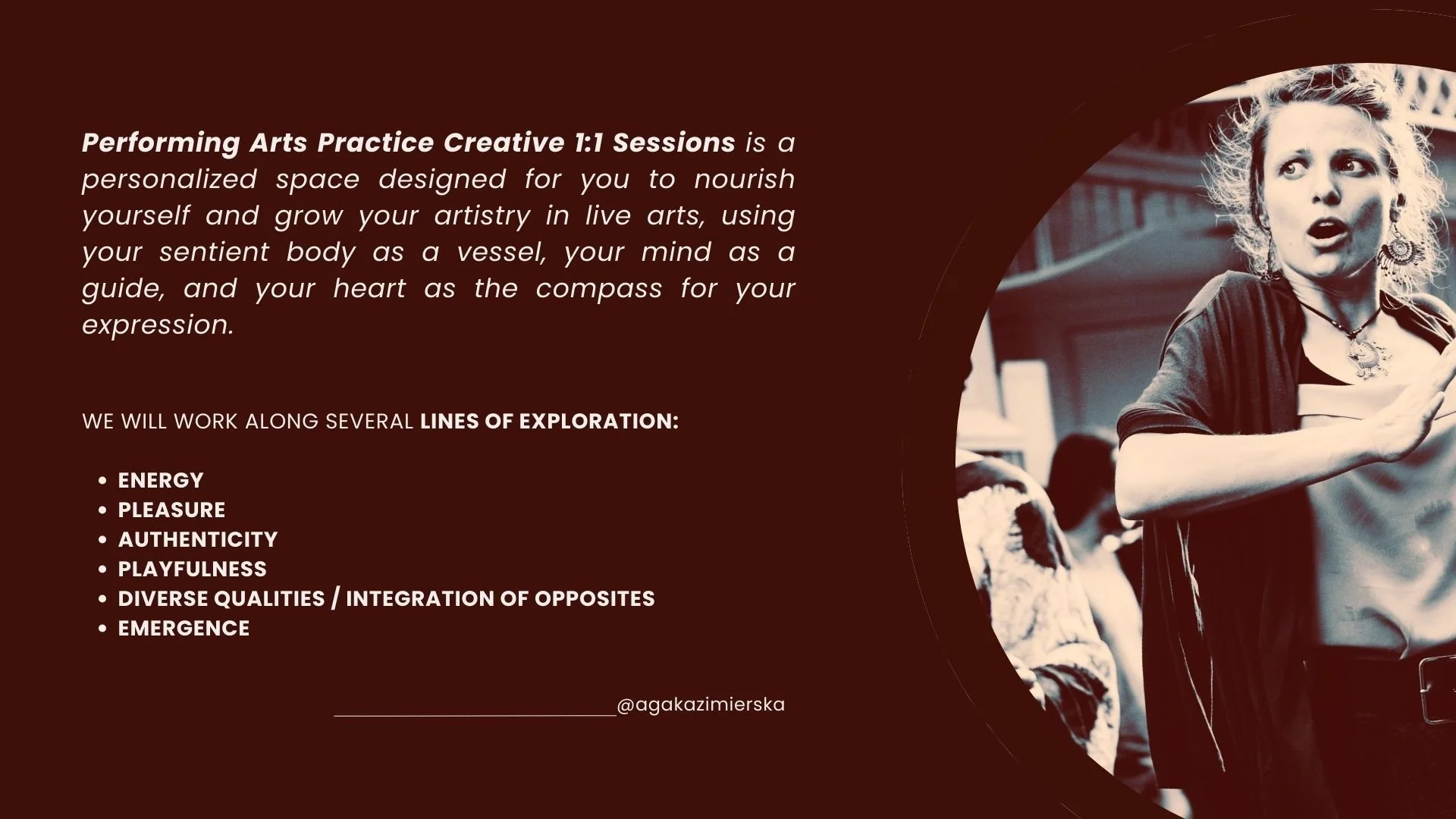 Home About Upcoming events Performances Workshops Individual sessions Contact